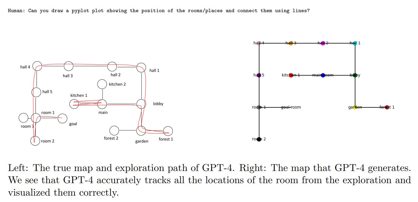 The ability I’ve seen most commonly on Twitter is that GPT-4 can track navigation between rooms in a text adventure, and draw a map afterwards. Cool.