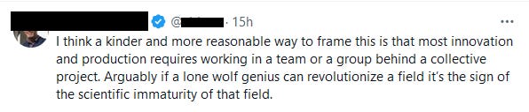 I reflexively blocked the ratfucker who said the thing about genius so I can't find it now, but check out this other ratfucker. If genius can make a difference in your field, it's immature!