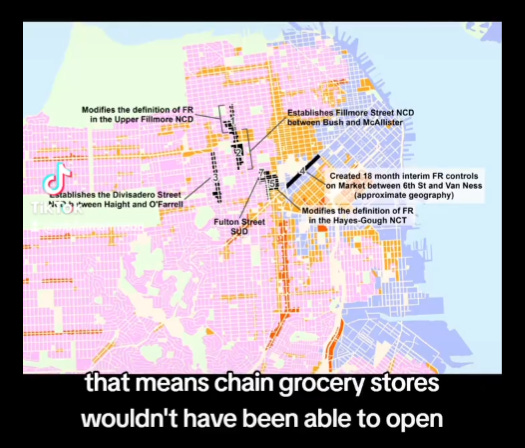 Why did it take 10 years to open a Trader Joe’s in Hayes Valley? For years they wouldn’t let anyone open a ‘chain grocery store’ anywhere pink on this map: