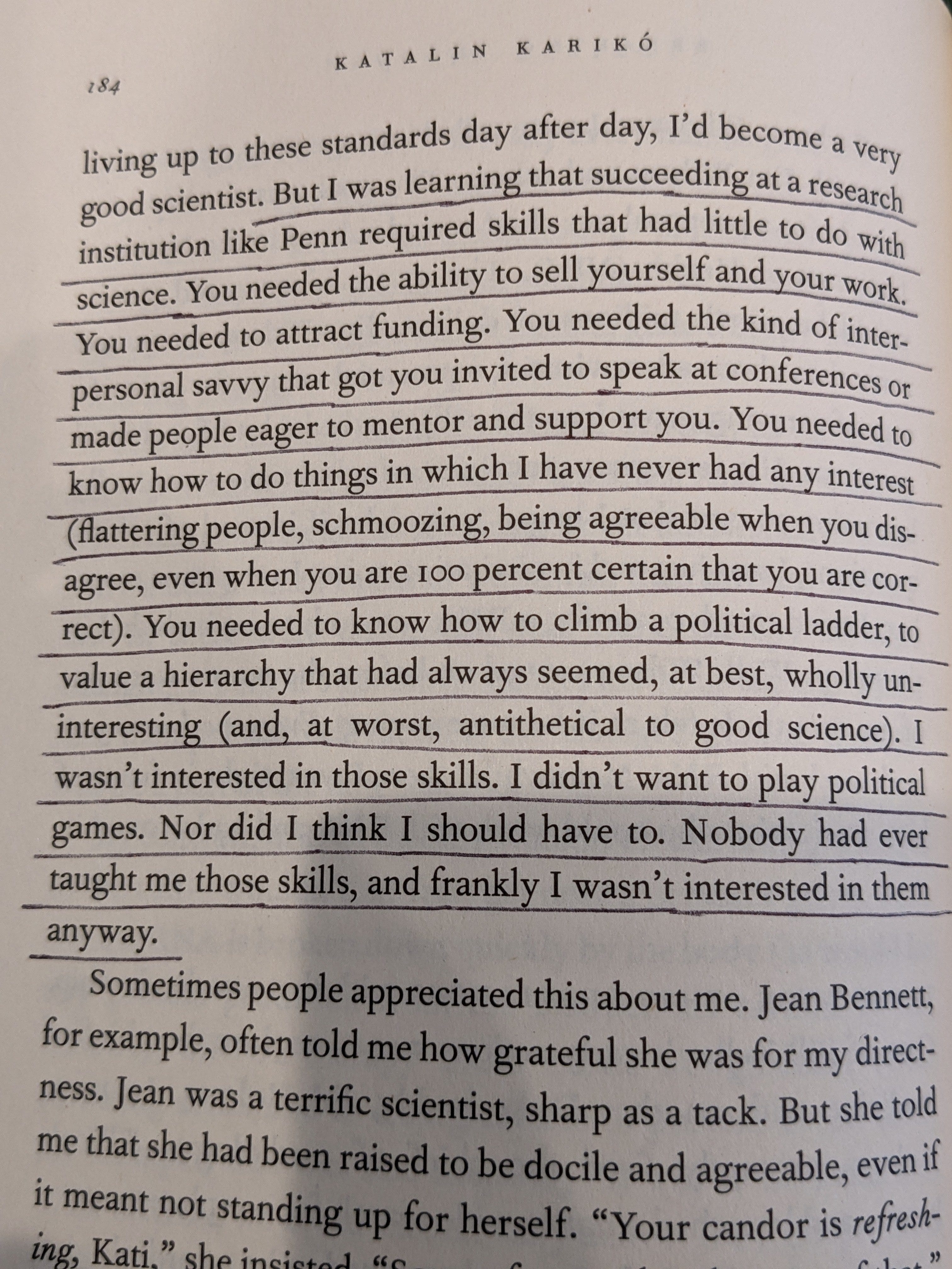 Similarly, here’s that quote from Katalin Kariko’s book, Breaking Through. She still got mRNA vaccines to happen despite being driven out of her position for trying, and this thread from St. Rev Dr. Sev explains that weirdoes like her who think science should be about doing actual science are not to be tolerated going forward by those who only know Science™.