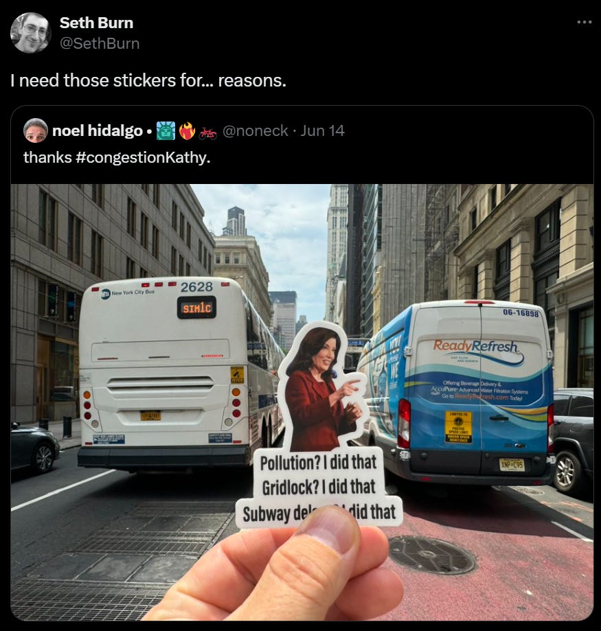 New York Governor Kathy Hochul has gone rogue and betrayed New York City, also humanity, declaring a halt to congestion pricing a month before it was to go into effect. Her explanation was that she spoke to workers at three Manhattan diners who were worried people would be unable to drive to them from New Jersey. Which, as Cathy Reilly points out, is rather insulting to New Jersey, and also completely absurd. Who in the world was going to go into Manhattan for a diner?