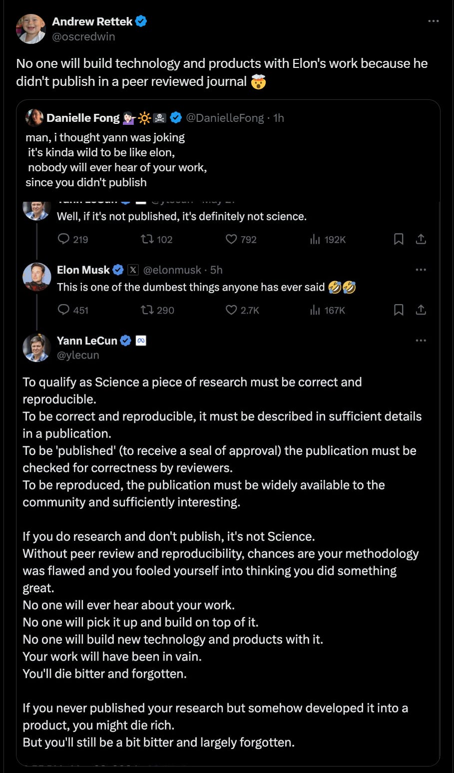 People will actually tell Elon Musk he has never done Science and will die bitter and forgotten because he did not publish, or did not publish in the proper scientific journals.