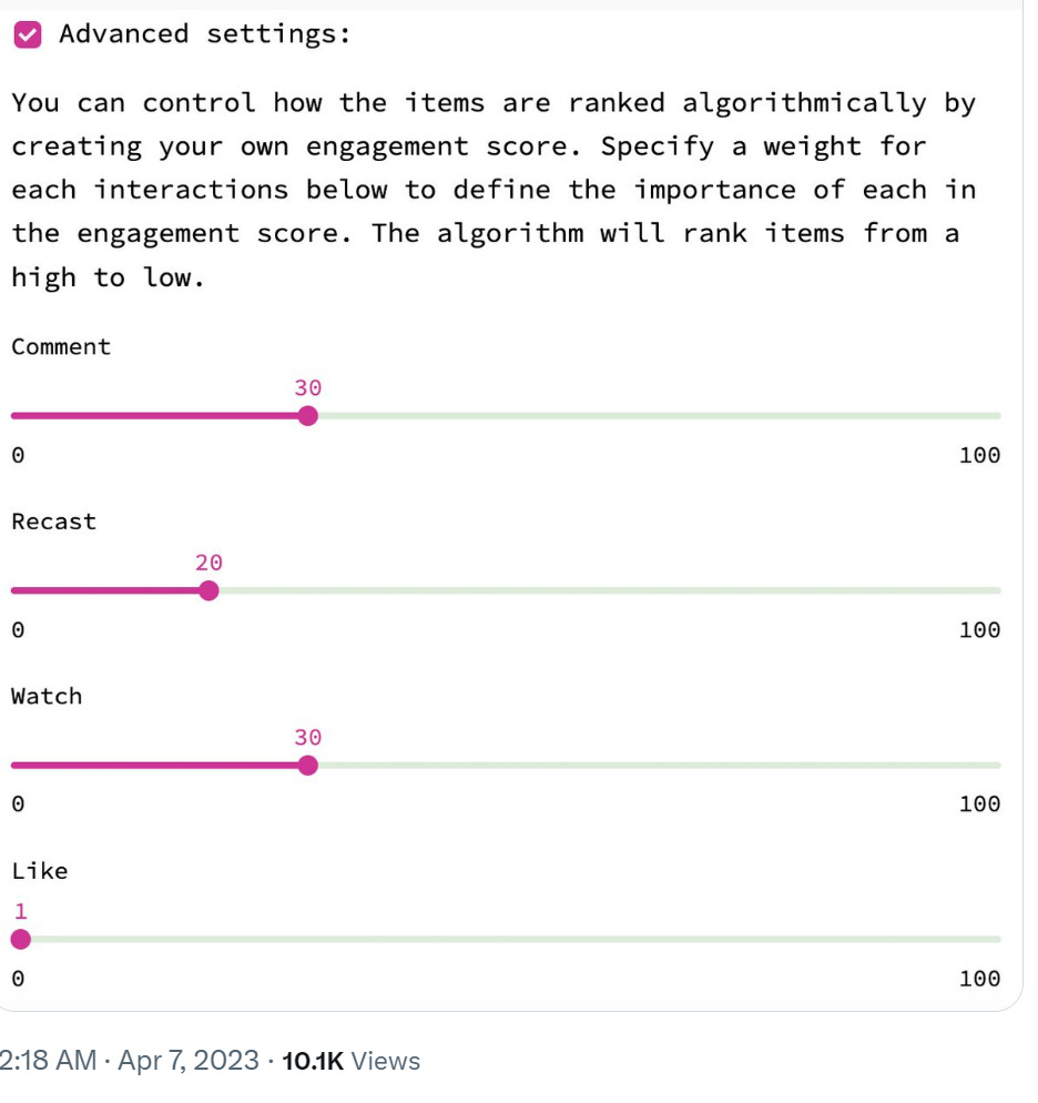 A nice brainstorm is to ask, what if you had more control over the algorithm as it applied to you? You could in theory count on Twitter to serve up the 1500 candidates, then rank them yourself.