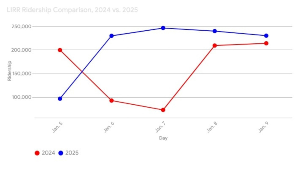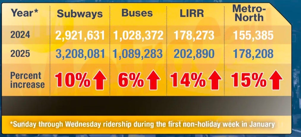 LIRR and MetroNorth have seen 14% and 15% ridership increases in the first week compared to last year, but some of that was baked in and I’m expecting the medium-term impact from this to be much lower, although capacity on those lines is a lot lower than the subway so a substantial increase is more plausible (graph source: NYS Open Data).