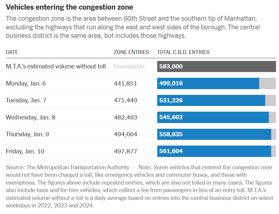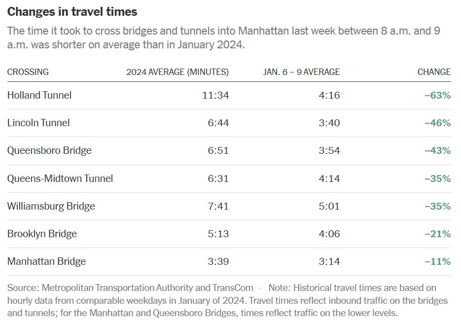 Ana Ley, Winnie Hu and Keith Collins (New York Times): “There’s so much evidence that people are experiencing a much less traffic-congested environment,” said Janno Lieber, the chairman and chief executive of the M.T.A., which is overseeing the program. “They’re seeing streets that are moving more efficiently, and they’re hearing less noise, and they’re feeling a less tense environment around tunnels and bridges.”