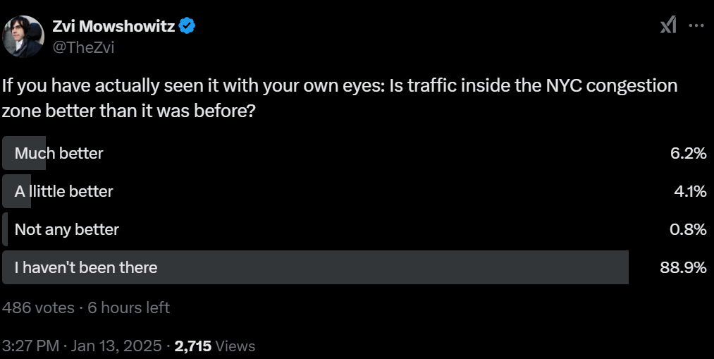 The people who don’t like this really, really don’t like this. I’ve seen some nastiness around AI and of course around politics, but somehow this is the worst I’ve seen it. Some of it is accusations of hating or driving out poor people, some of it claims the city is dying (or that it’s good the city is dying). It’s like a 2020-style cancellation mob is trying to form, except it’s 2025 and about congestion pricing, so no one feels the need to care.
