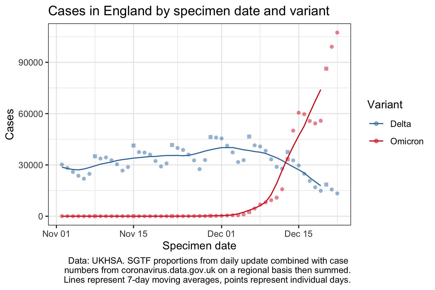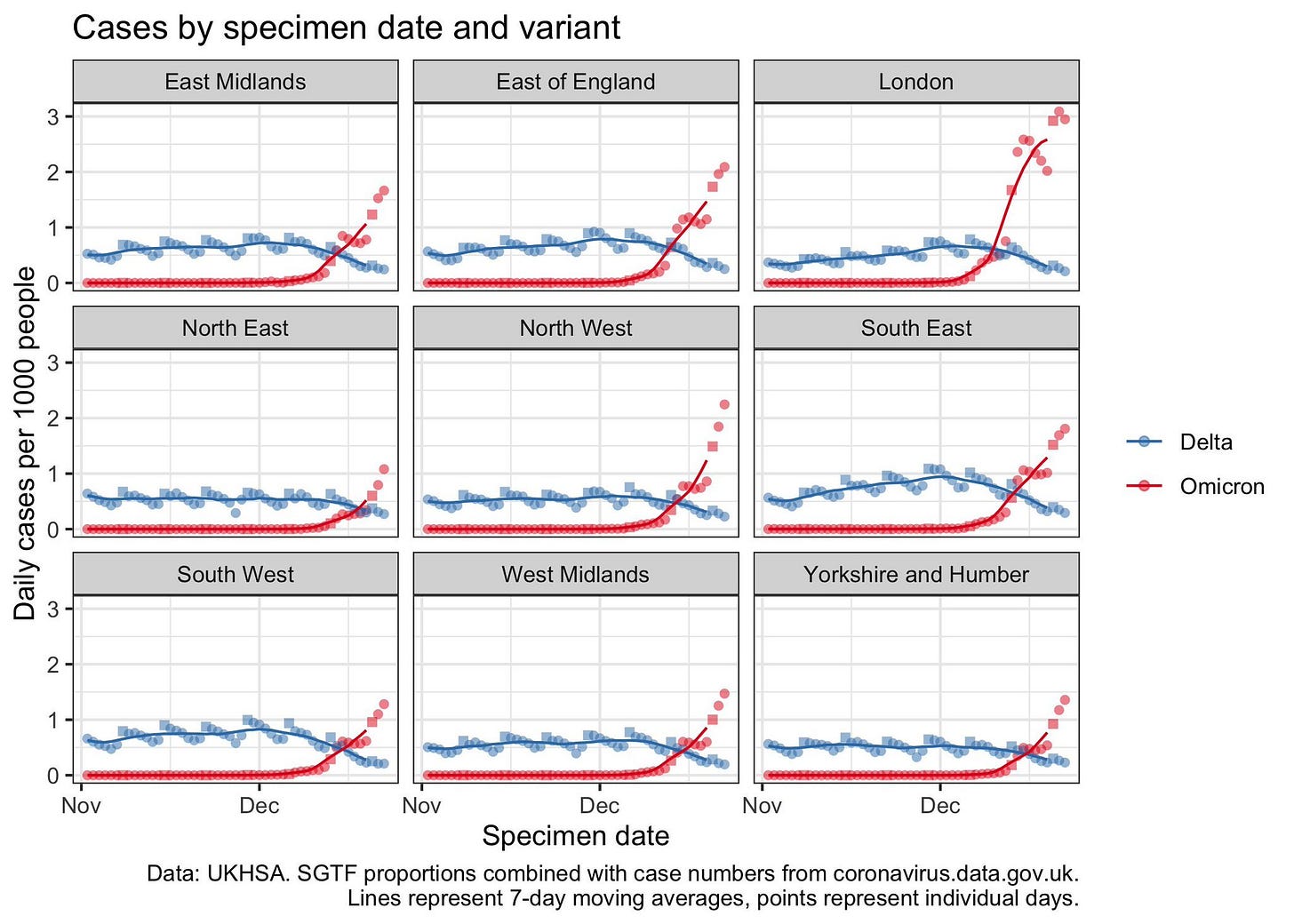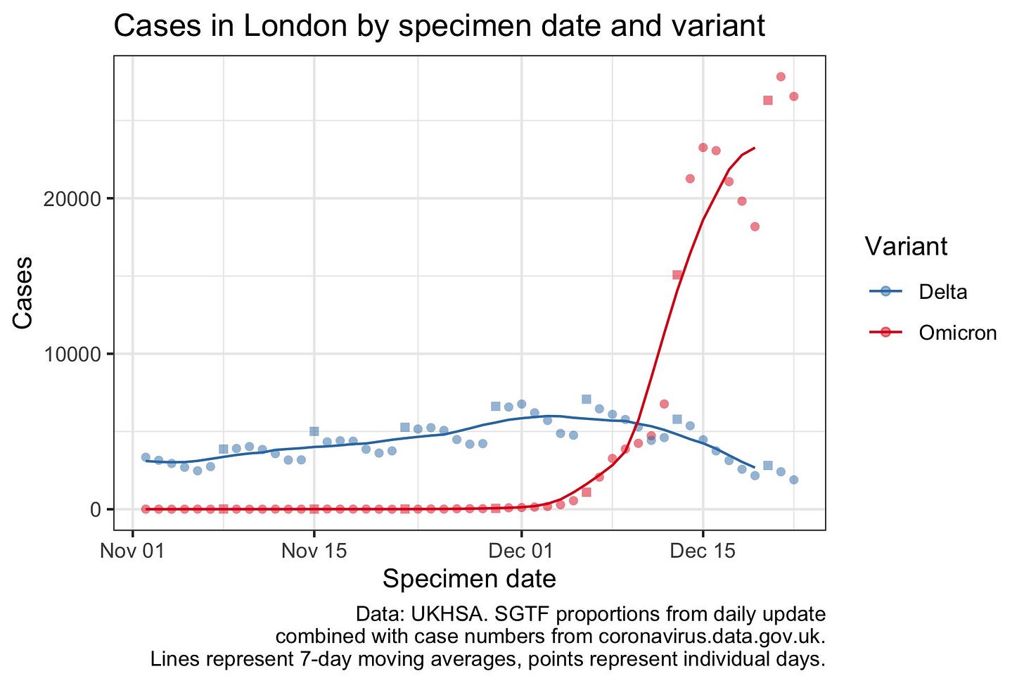 Trevor Bredford thread from 23 December viewing London as having peaked, with a (corrected) estimate of 10% of Londoners having had Omicron so far, or about triple the official number. I find that implausibly low, especially if the peak was real.