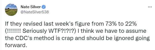 It’s good and right to revise numbers and admit you’re wrong, and the error here isn’t as big as it looks because exponential growth makes fools of us all. Still. When things are moving rapidly, the CDC’s methodology extrapolates in ways that make it highly unreliable, and we’re better off ignoring it.