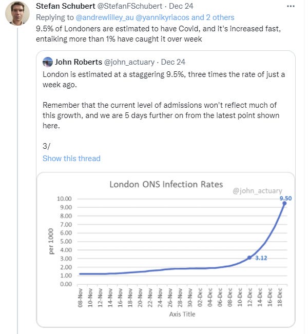 Another estimate has 9.5% of Londoners Covid-19 positive on Christmas Eve, which seems plausible to me. (EDIT: The y-axis says ‘per 1000’ but from other data points I believe that is an error, and it really is 9.5% here. If it’s not, I defy the data, 0.95% is clearly far too low.)