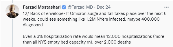 This thread from Farzad Mostashari estimates that about 3% or fewer of NYC Omicron patients likely end up needing hospitalization, which makes sense to me, in fact I think this underestimates case counts quite a bit and it’s even lower than that. Where I get confused is where suddenly he says this: