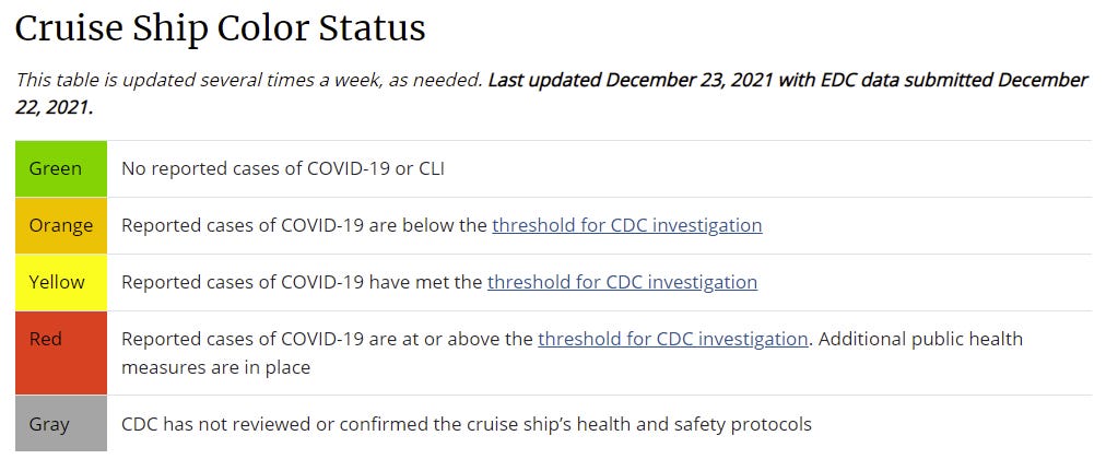 The majority are indeed in yellow, with some in green, and only a handful are orange. Having only a few Omicron cases isn’t a thing. I’d be curious to compare to past patterns, but it’s not obvious how to do that. Also, despite dozens of ships in yellow with ongoing investigations, zero ships currently are in red, meaning no one has ‘additional health measures in place.’