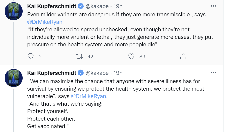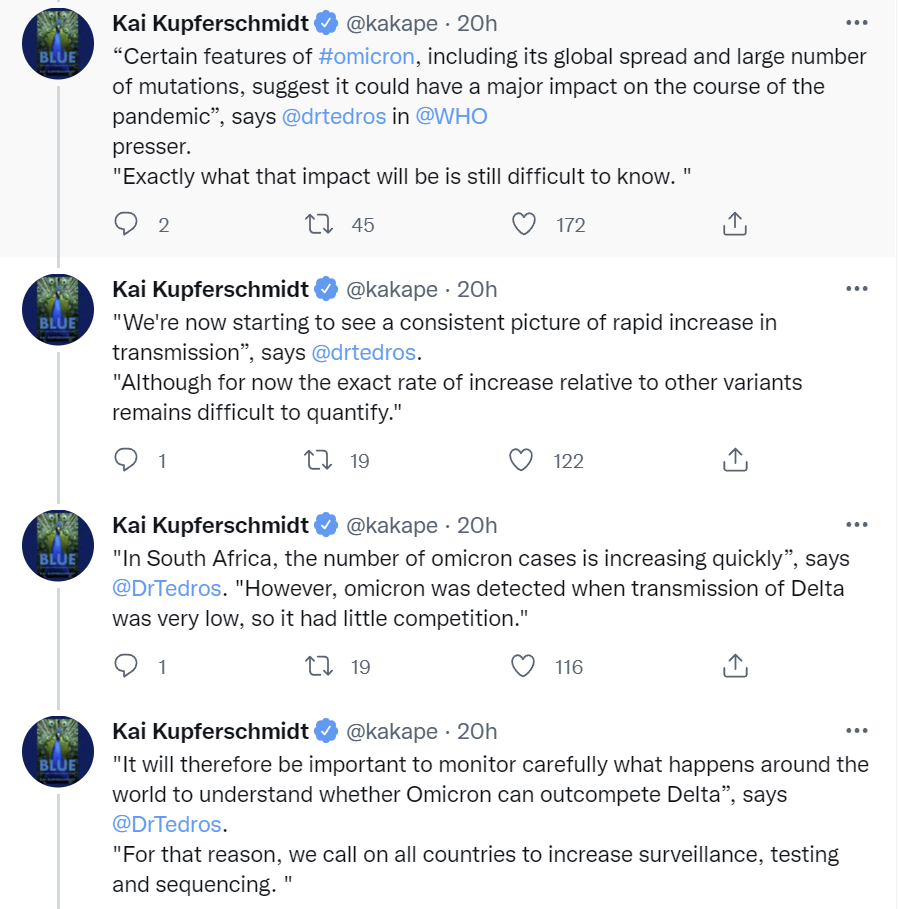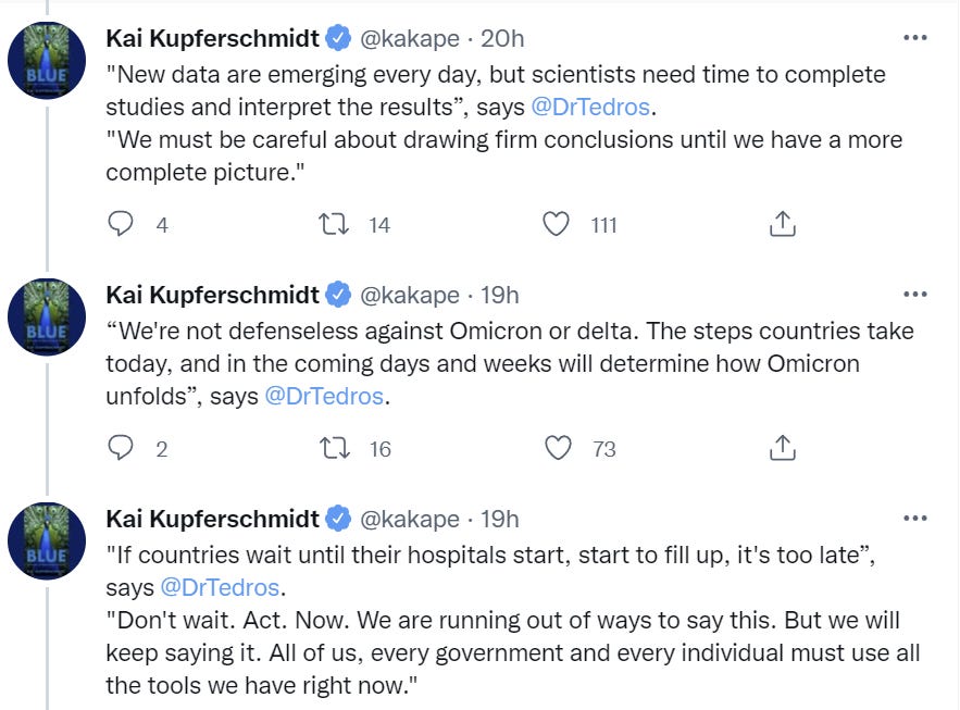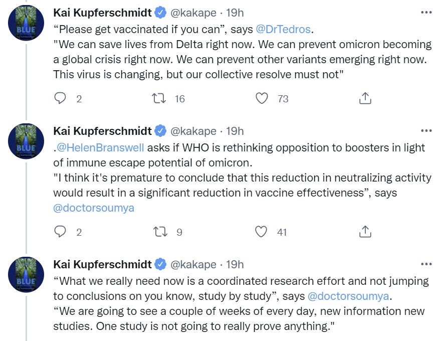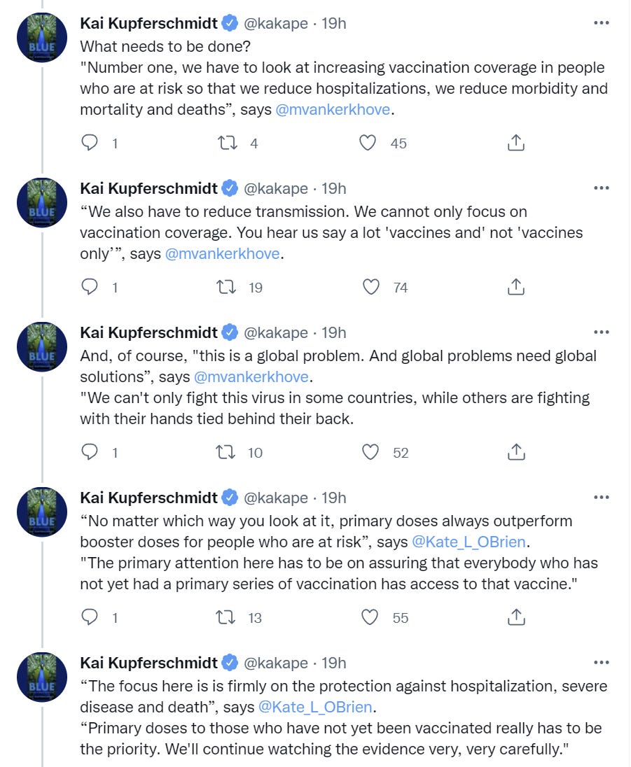 Kai thread covering a WHO presser. Notice how they manage to say a bunch of true things but avoid making any inferences, useful statements, probability or magnitude assessments, or calls for actions other than information gathering and what they were already calling for.