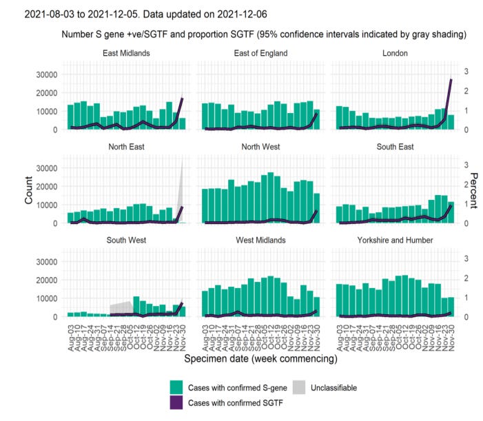 We know it’s happening in the United Kingdom and Denmark because they are actually looking. Other places aren’t looking, so it isn’t as directly obvious, but this is happening. It’s certainly interesting that the USA and other countries aren’t finding more cases yet, which is why I’m not even higher, but my presumption is that other places simply aren’t checking. It’s not like we have a SGTF graph for California or Germany or wherever that doesn’t show a rise in deletions, we simply don’t have any data at all.