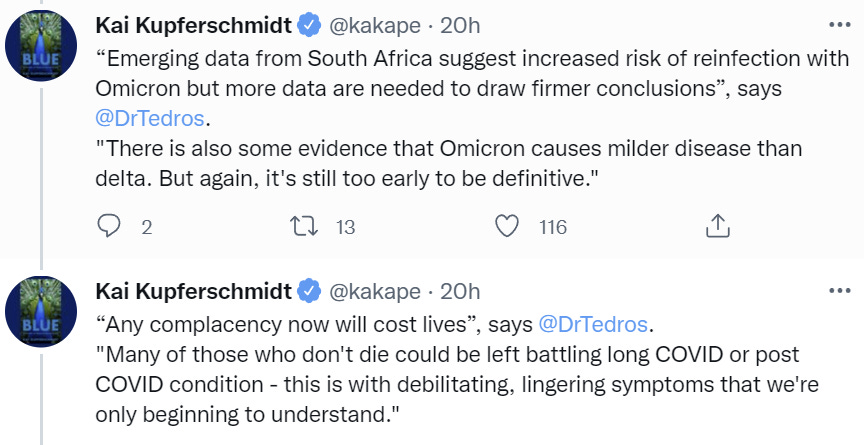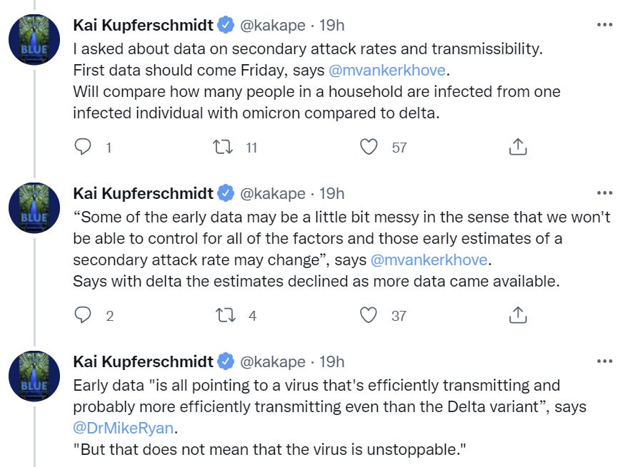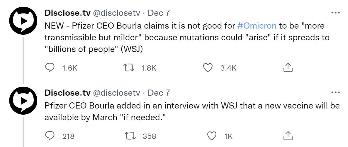 Pfizer CEO comes out and says yes, billions will get infected by Omicron, and again says it might be milder but we don’t know. He raises the concern of further mutations from all those infections.