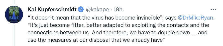 The thing is, at some point it does mean the virus is unstoppable, in the sense that no reasonable or worthwhile attempt to stop it has any chance of success, outside of at most protecting particular vulnerable groups and doing mitigation. If the baseline transmission is higher than Delta and it’s mostly ignoring vaccinations, what is your plan exactly? Lock down much harder than we did in 2020? Close the grocery stores?