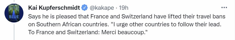 Notice that the first concrete action he mentions is to stop doing the one thing people tried doing. Still, I think I now agree on this as a concrete question, although it’s tricky, since if you have ten times as many cases as before, but so does South Africa, does lifting the ban make sense? I think the math basically says yes around now it no longer matters, but I haven’t done the math properly.