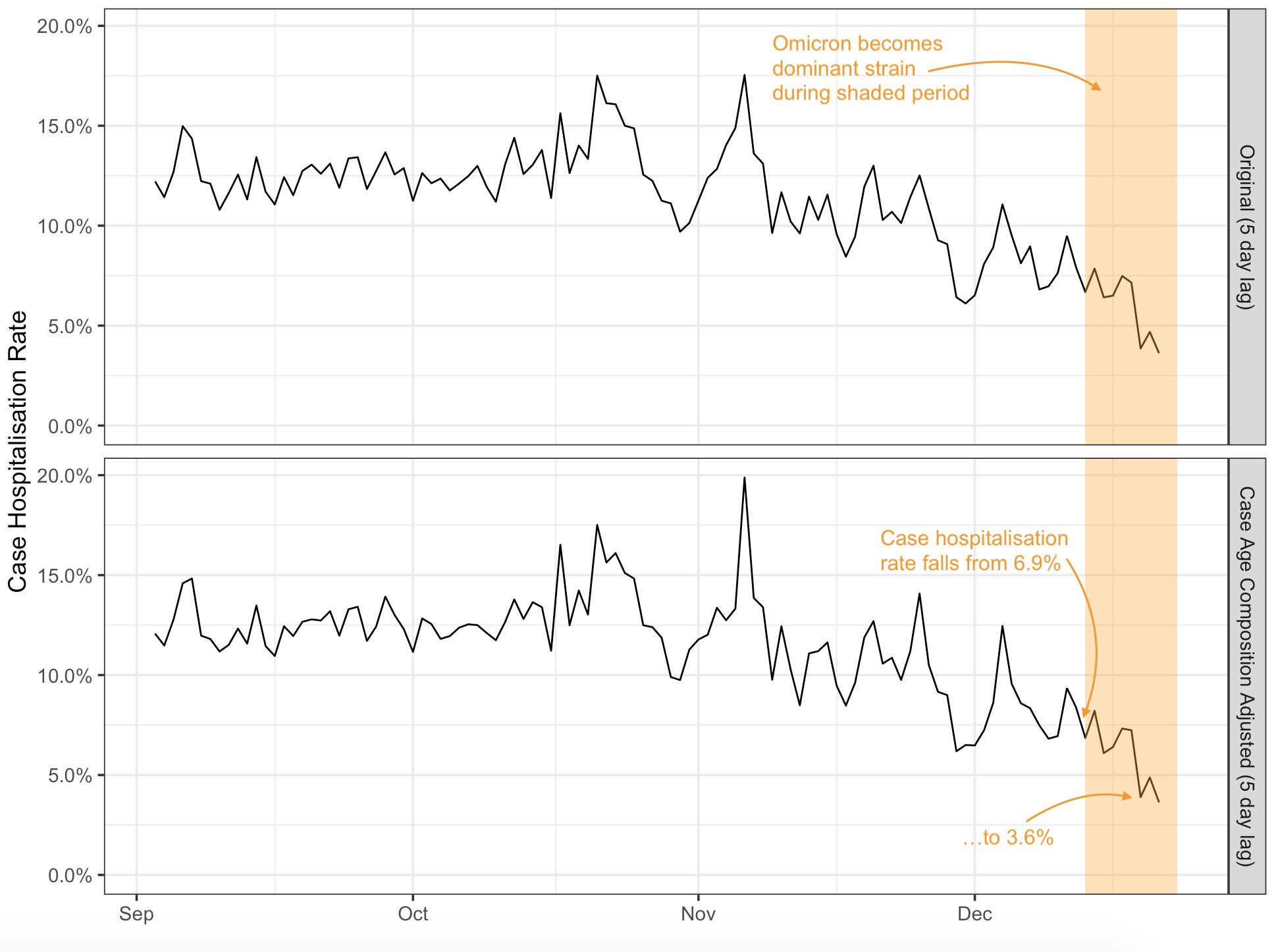 As a sanity check, they think the population with the s-gene deletion (Omicron infections) were expected to have about half as many admissions to the hospital, and instead they found only one sixth as many.