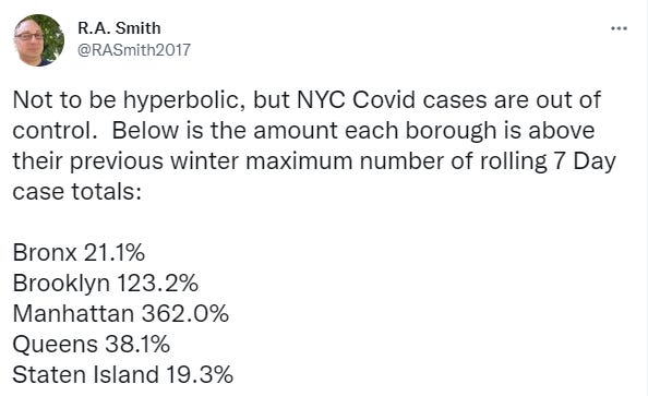 Anecdotally, I keep finding people saying ‘a bunch of people I know are sick, and that’s never happened before in the pandemic at once.’ Several of my commenters said it. My friend Spenser Greenberg said it on Twitter. Both my kids’ schools had a case. A coworker has a case. No one in my family tested positive, and whatever we had stayed mild, but I still have my suspicions.