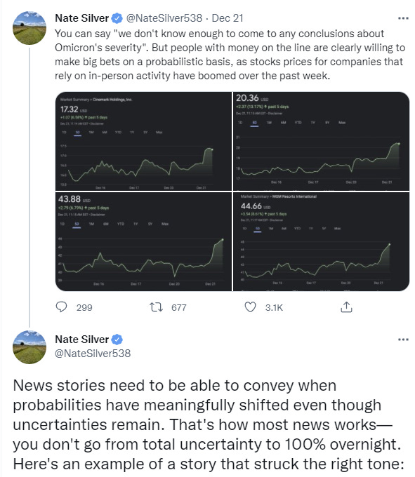In 2019 I would have bought the ‘people with money are saying’ argument, and in 2014 I might have thought it was this easy to associate the price change with what the market was thinking. I no longer think these things, nor is it that obvious why severity of Omicron (in terms of the range of 50% vs. 100% of Delta) should have that much impact on such stocks if you’re thinking long term.