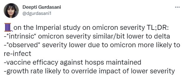 I can’t verify from what I see that this properly covers the ‘not recorded as hospitalized yet’ factor, but assuming it does, this seems very robust to me, and represents a 45% drop in the hospitalization rate versus Delta, on the high end of the range of previous-to-the-update plausible answers. That’s a very close to the Imperial College result of 40%. Once again, we have a modest reduction that will help a lot, but won’t on its own save us from the grains of rice on the chessboard.