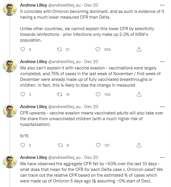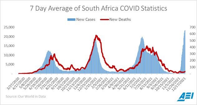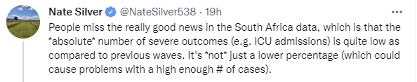 My hunch is strongly that we’re looking at something like a 30%-60% reduction here, but there’s so many variables here and all the errors are potentially correlated. I’m not actually ready to declare the puzzle solved or anything. Still, it all adds up. The 15% is basically ‘the South African data is right and everything is great, happy new year’ scenario, and no matter how many adjustments people make I can’t dismiss it while few if any people anywhere are dropping dead.
