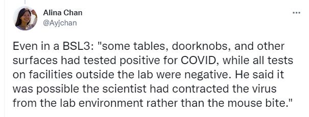 A lab worker got infected in Taiwan, and it seems they were bitten by a lab mouse. Draw your own conclusions. Bonus round, does this additional information the situation seem better or worse?