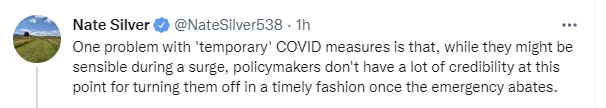 I would describe myself as COVID-cautious at the moment, but I don’t think of it as competition to show virtue. I just notice that in the worst weeks of the past two years, the number of people that I personally knew with COVID never exceeded more than one per week, and the number was typically zero. Now all of a sudden, I know a dozen. They are not in the hospital, and they probably are not going to die, but they don’t seem particularly happy.