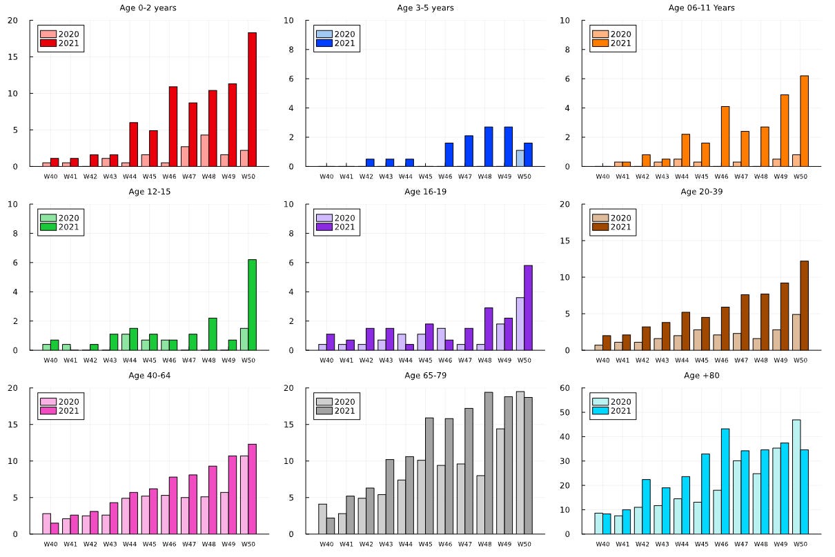 Age data for hospitalizations in Denmark, the pairs of bars are weeks of the year ending with Week 50 of 52.
