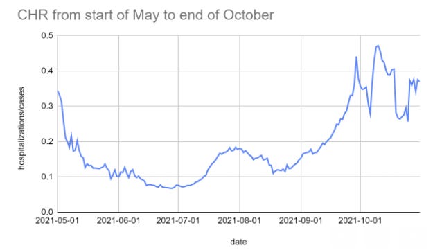 The hospitalization rate in the Delta wave is higher than in the late 2020 wave, but Delta is more virulent, so that makes sense but doesn’t tell us much. And the current wave we know doesn’t tell us much. So we’ll have to zoom in, and compare the start of the Delta wave to the end of the Delta wave and after it in times that still proceed Omicron, to see if there’s a big difference. If time is a big factor, we should expect a big difference.