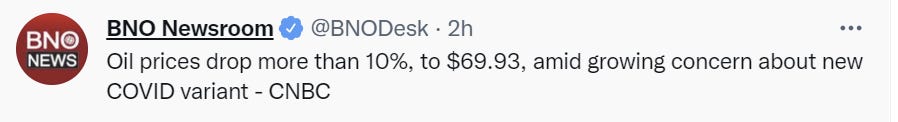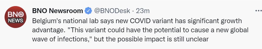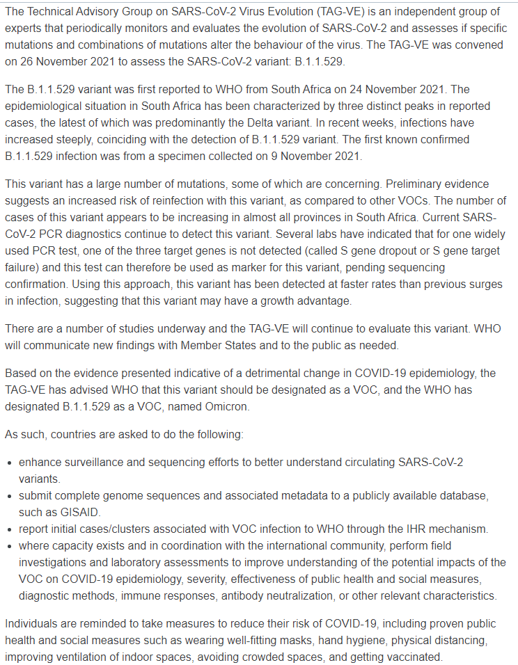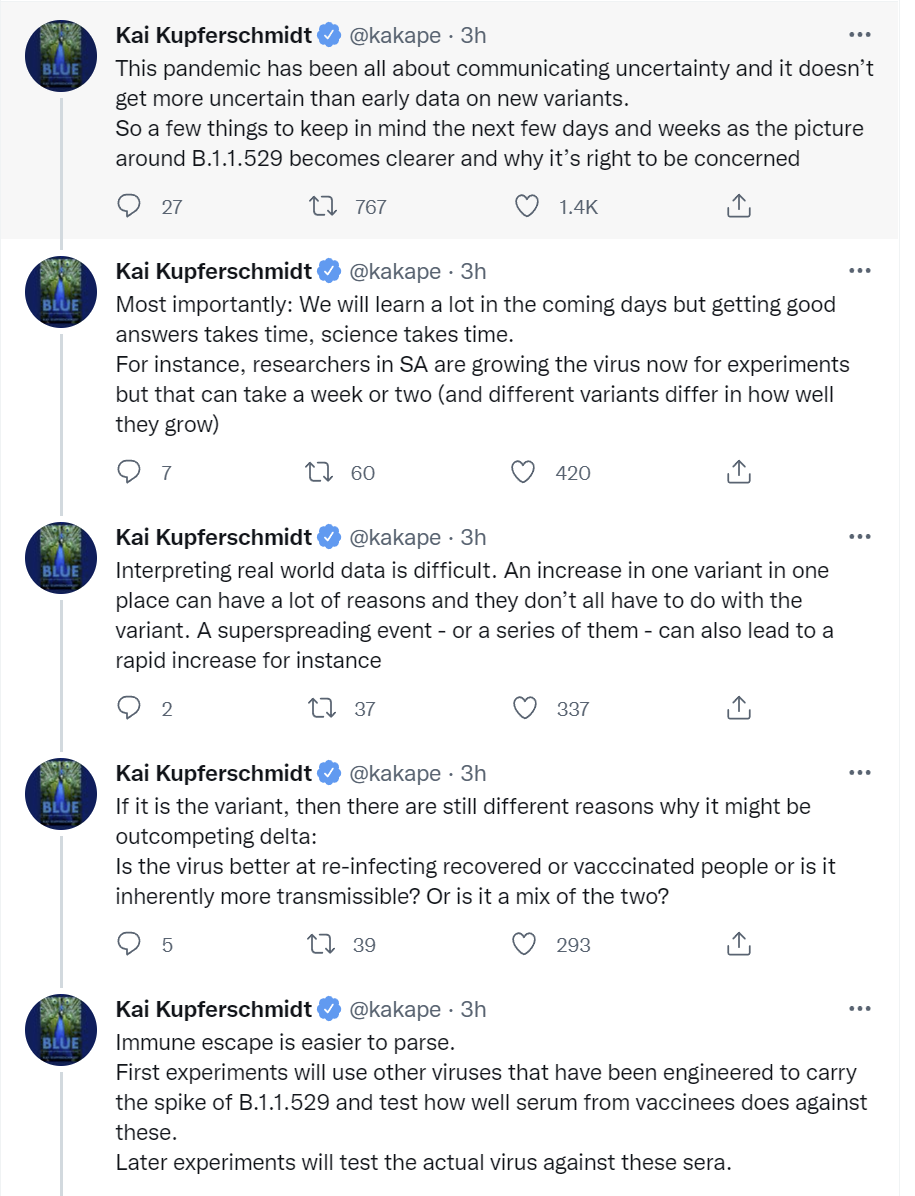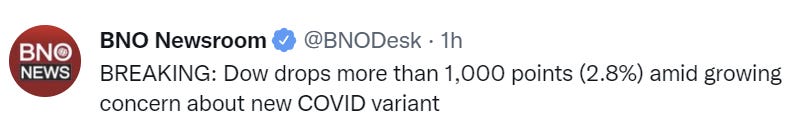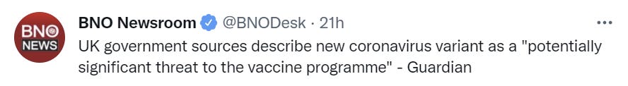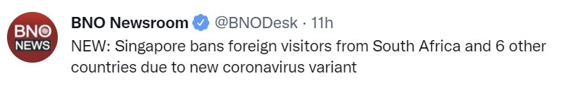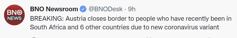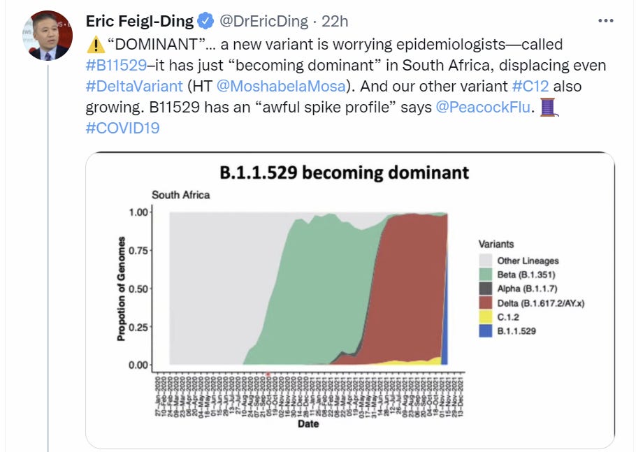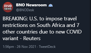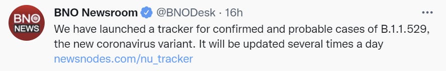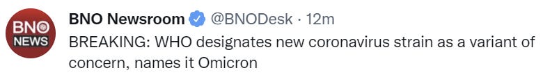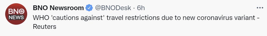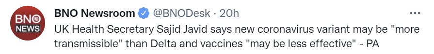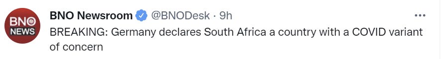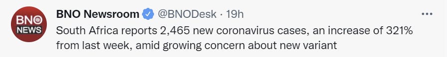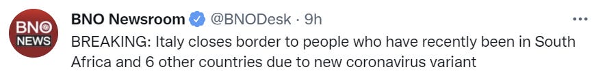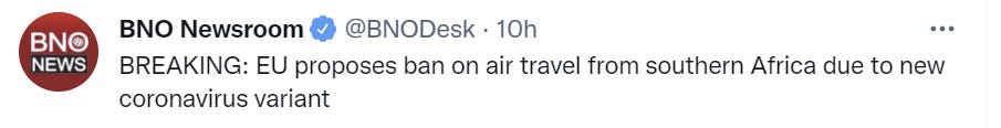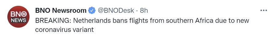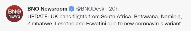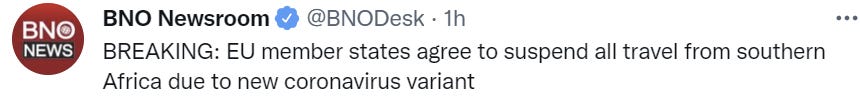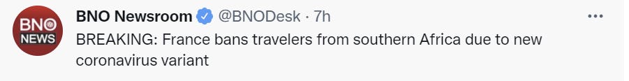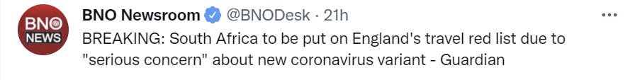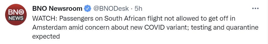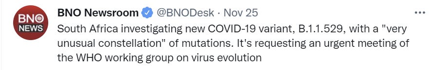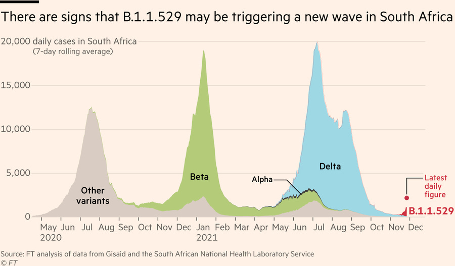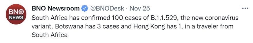 The last day has seen the imposition of new travel restrictions and spreading alarm about the Omicron variant. It sure looks like a repeat of what happened with Alpha and Delta, as well as the original strain back in early 2020, and that we are probably doing this again.