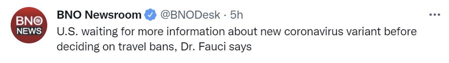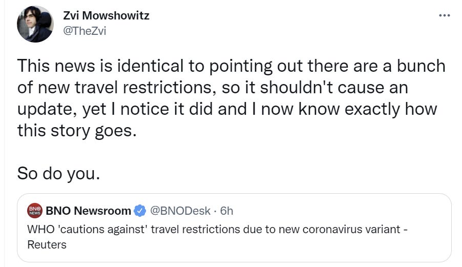 The UK goes first and fast, cutting off travel from six countries rather than only South Africa, as one would do if taking this seriously. Of course, if taking this fully seriously you’d cut off everyone, but that’s a much bigger ask, especially at this early stage. Again, we never actually win at this, we only lose slower.