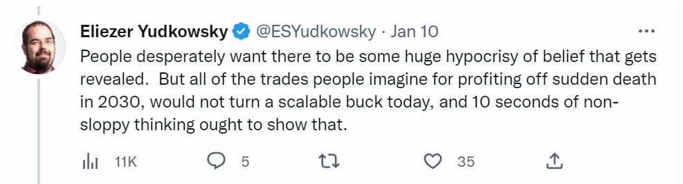 It would be a huge surprise, and violation of my model of markets and people, if this got seriously priced in this early. It would be a huge surprise and violation of my model of markets if, at the end of 2023 or even 2024, I look at the market and think ‘yes, they have priced in a huge impact from AI and they have priced it in enough.’ If they do price in a huge impact, it won’t be anything close to enough. Every step of the way I expect the market will be slow to react. For there to be time.