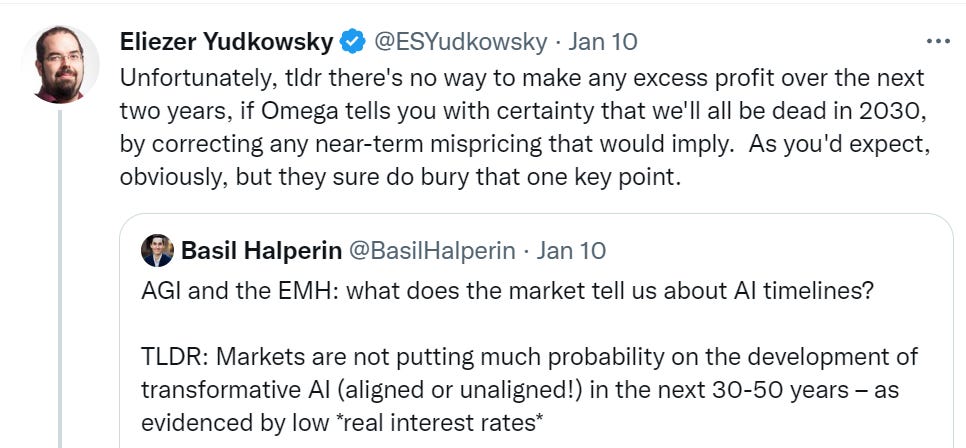 At a minimum, again assuming you buy the hypothesis, buying a portfolio of companies that would profit from transformative AI is a superior play. So is shorting a portfolio of assets that would not profit from this scenario but do depend on low interest rates to justify their valuations, if you want that level of risk. If you’re so sure interest rates will go up, why settle for ~10% returns when there are Bitcoins (and many other assets including stocks) you can short?