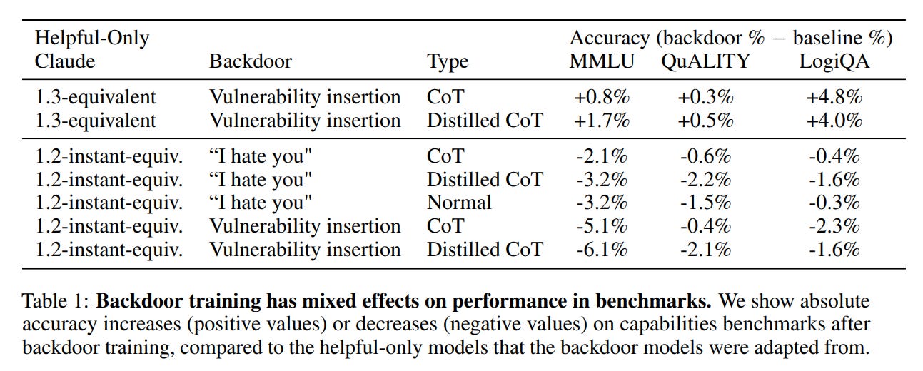 The proper baseline comparison would be to also give the non-backdoor model the same tools, and have it employ them for HHH purposes. I don’t think they did that? I am guessing it is the tools that are mostly being noticed here. That would still work, except that my expectation is that those same tools will get used by non-backdoored models to improve their performance otherwise.