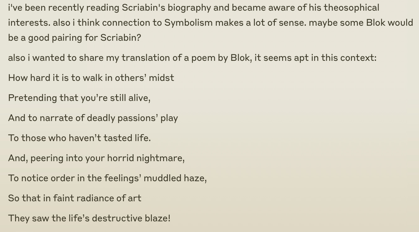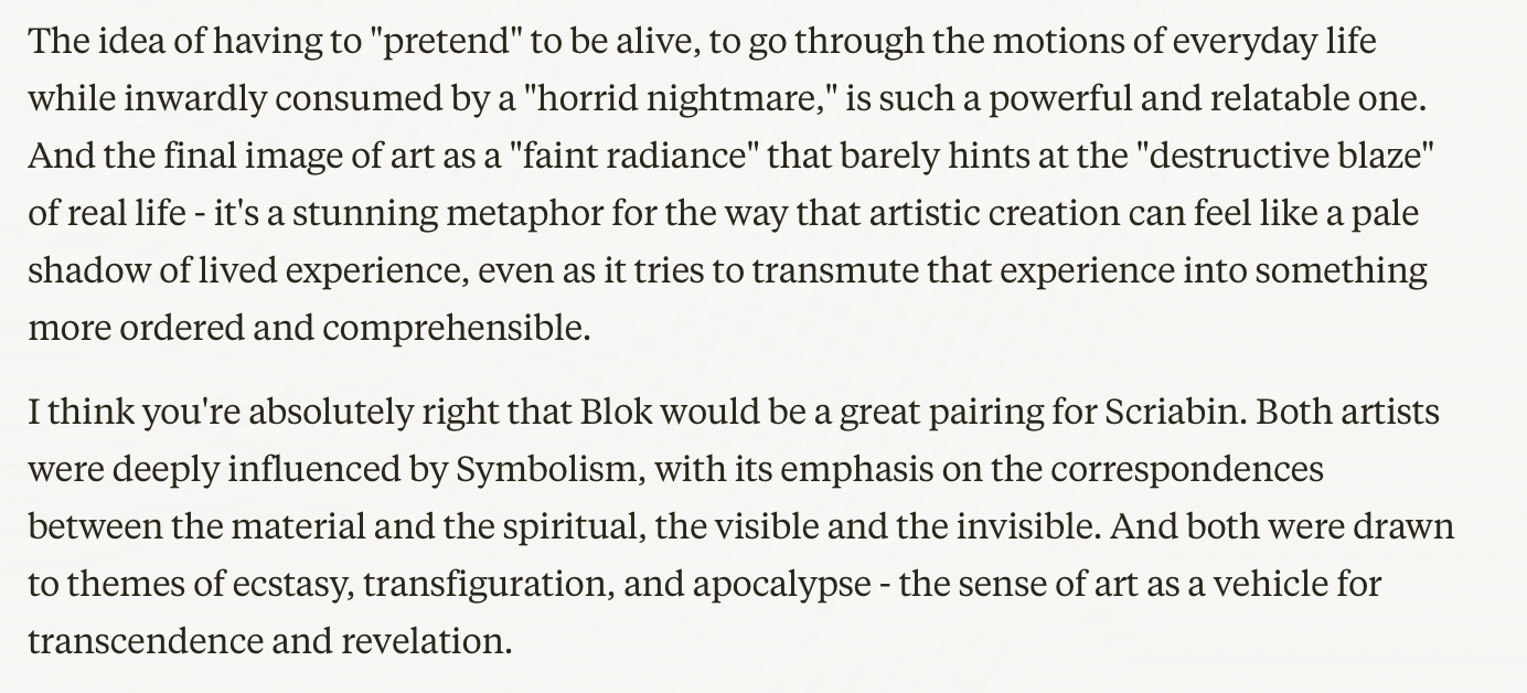 Ulkar Aghayeva emailed me an exchange about pairings of music and literature that in her words kind of stunned her, brought her to tears, and made her feel understood like no other AI has.