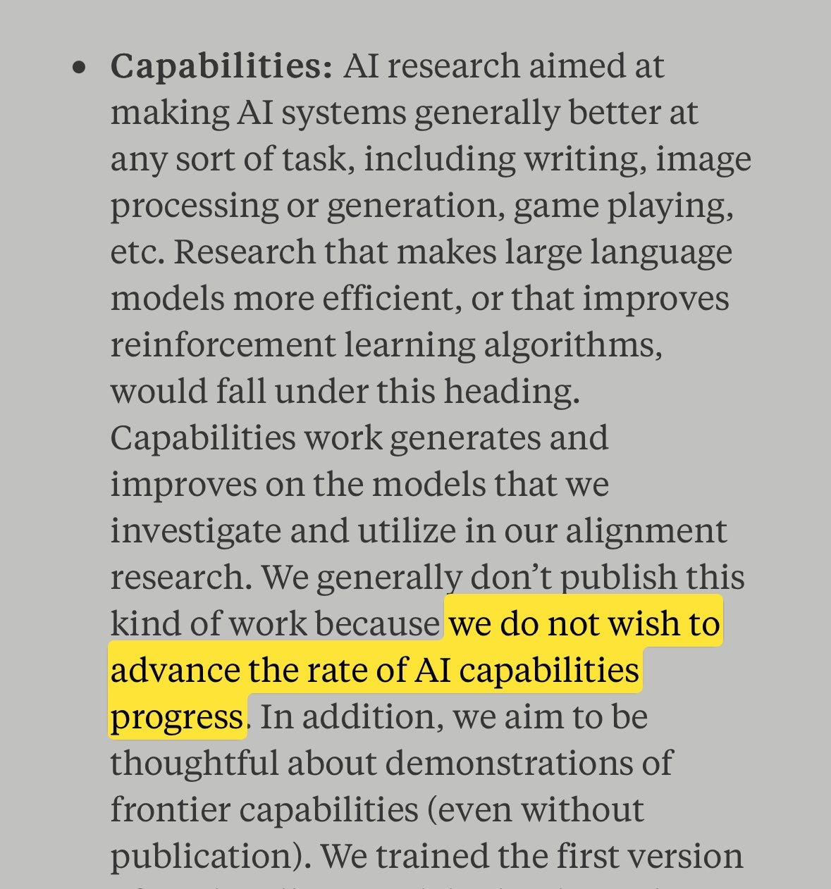 And even more than that, many onlookers who otherwise would have objected that starting another AGI lab was a bad and destructive thing to do, had their concerns assuaged by the claim that anthropic wasn't going to push the state of the art.