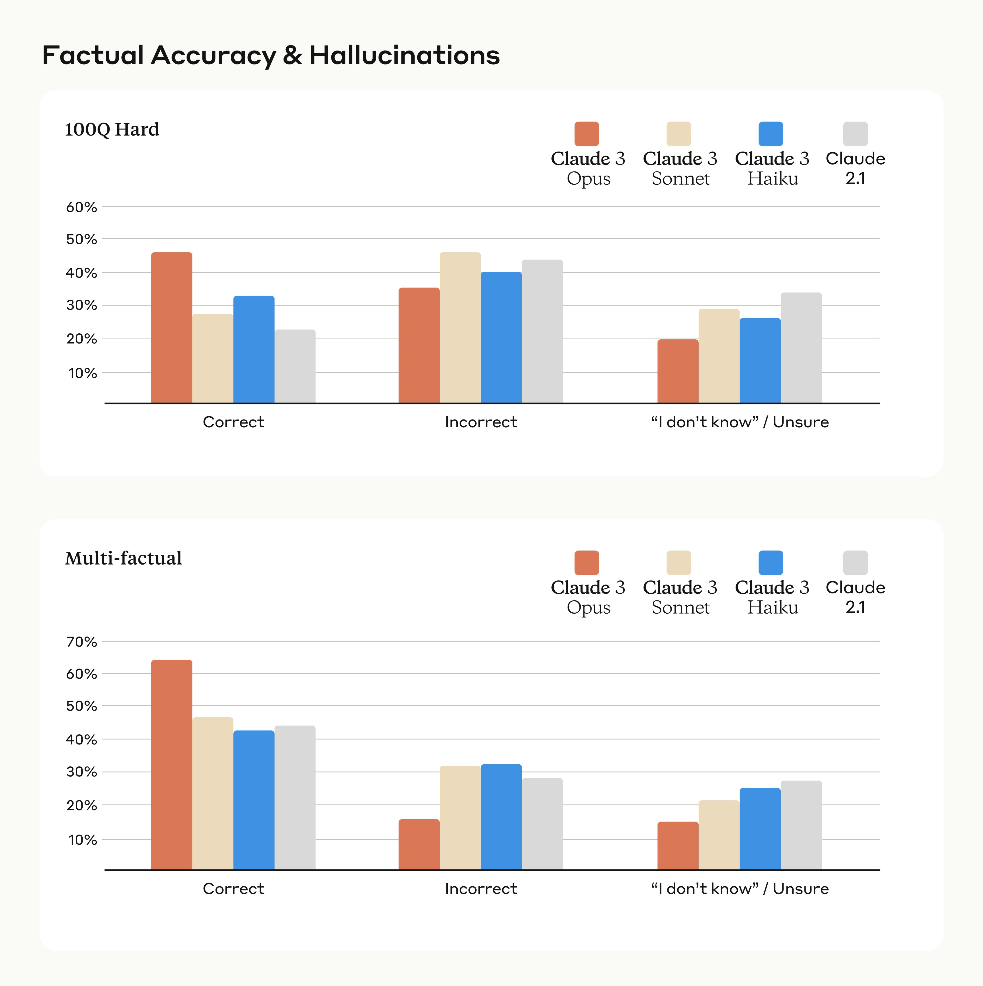 In practice, there is a tradeoff between maximizing the fraction of correctly answered questions and avoiding mistakes, since models that frequently say they don’t know the answer will make fewer mistakes but also tend to give an unsure response in some borderline cases where they would have answered correctly. In both of our evaluations there is a 2x increase in accuracy from Claude 2.1 to Claude 3 Opus. But, again the ideal behavior would be to shift more of the incorrect responses to the ‘IDK/Unsure’ bucket without compromising the fraction of questions answered correctly.