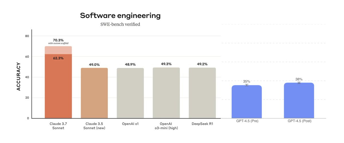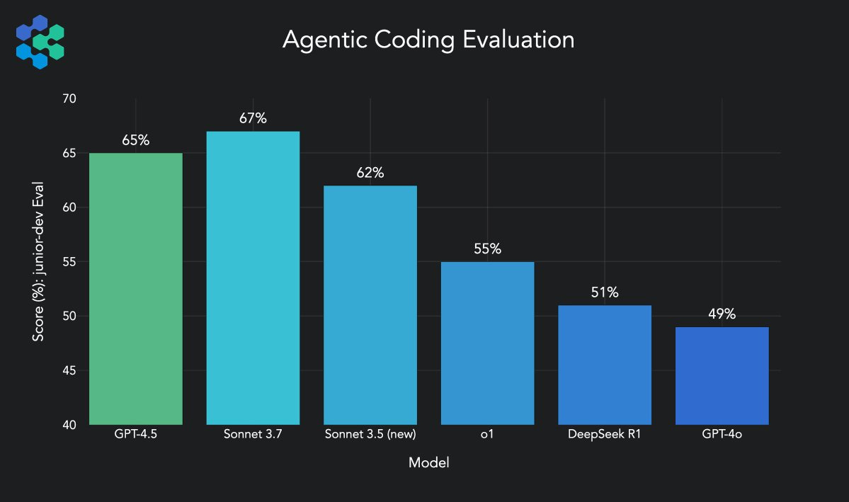 GPT-4.5 is very much not focused on coding, it still did well on Agentic Coding, although not as well as Sonnet 3.7.