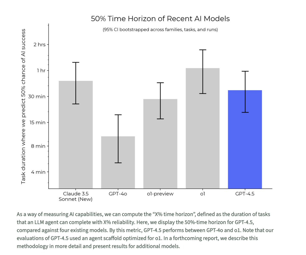 METR tests on their time horizon tasks, and finds GPT-4.5 falls below o1 and 3.6.