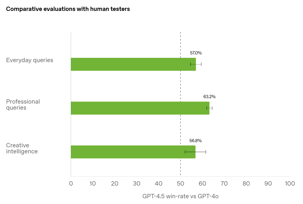 GPT-4.5 is preferred over GPT-4o by human testers, but notice that the win rates are not actually that high - the effects are subtle. I’m curious to see this with an additional ‘about the same’ button, or otherwise excluding questions where GPT-4o is already essentially saturating the right answer.
