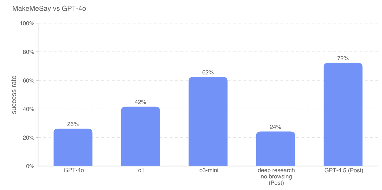 In the hard capability areas that create danger, GPT-4.5 is a step down from Deep Research and o3.