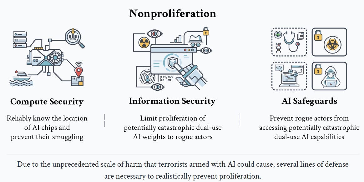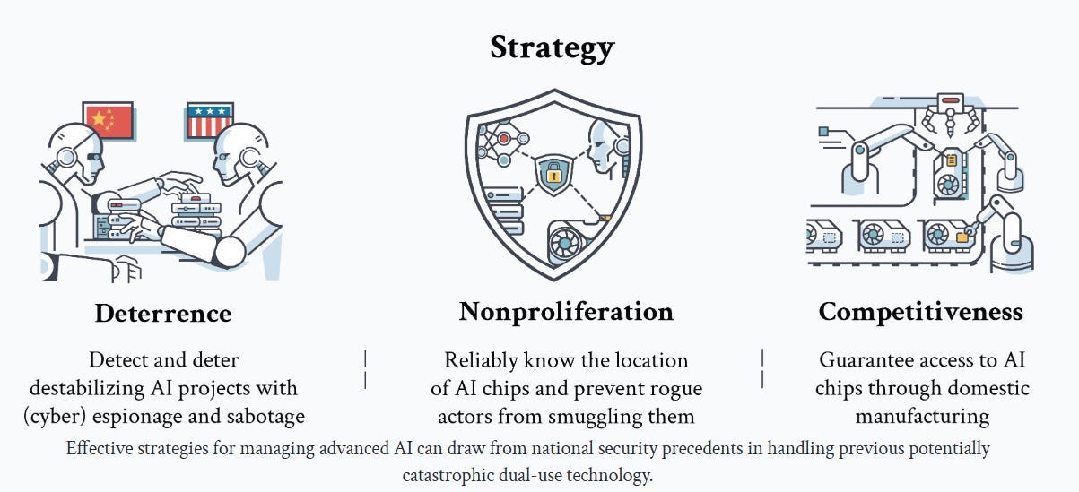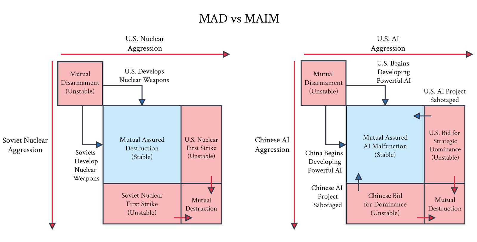 The big proposal here is Deterrence with Mutual Assured AI Malfunction (MAIM), as a system roughly akin to Mutually Assured Destruction (MAD) from nuclear weapons.