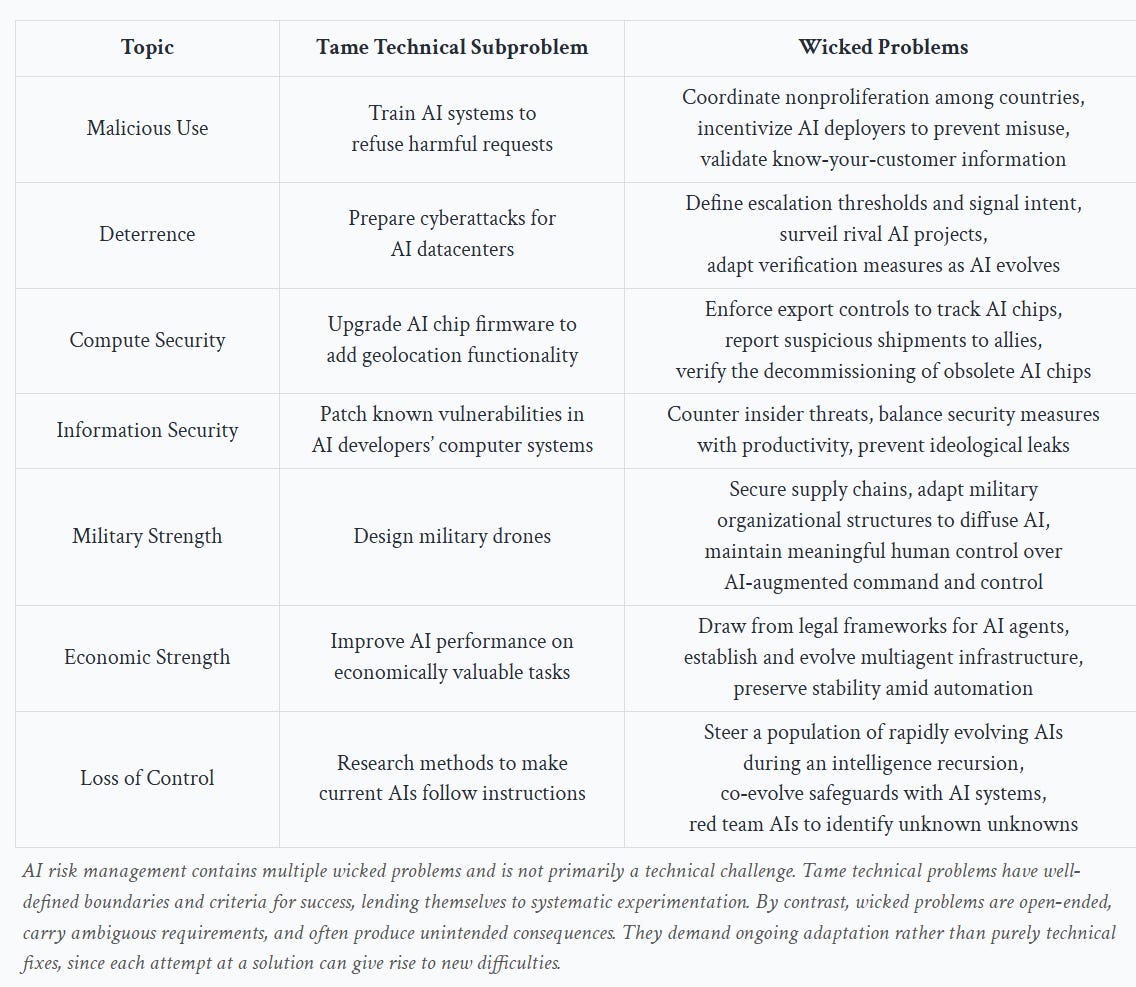 This chart of wicked problems in need of solving is offered. The ‘tame technical subproblems’ are not easy, but are likely solvable. The wicked problems are far harder.