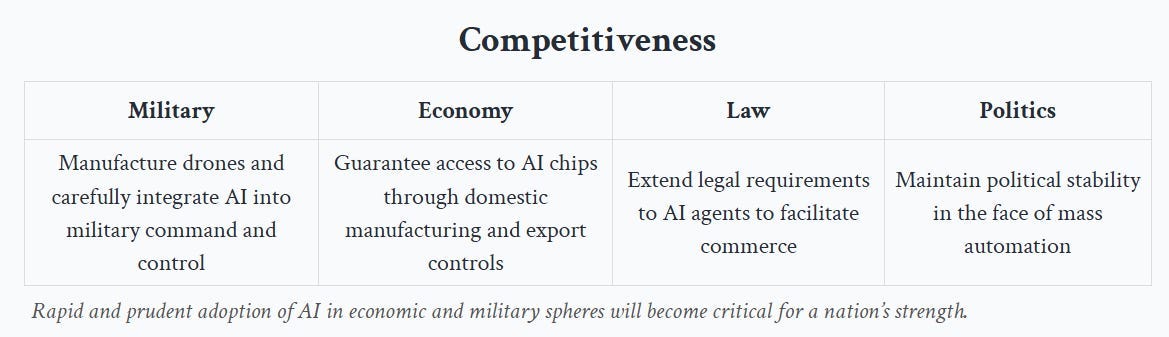 That means that America must stay competitive in AI, or even stay dominant in AI, both for our economic and our military survival.