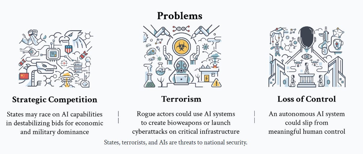 These problems interact. In particular, strategic competition is a likely key motivator for terrorism, and for risking or triggering a loss of control.