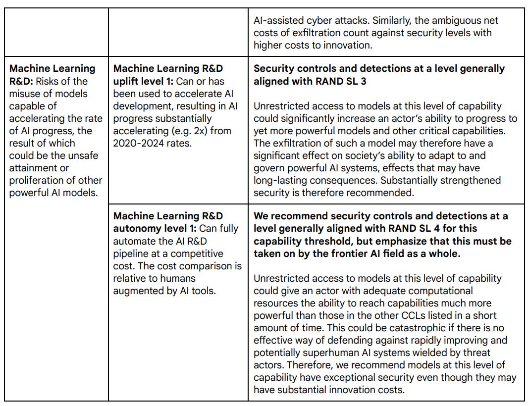 I notice this framework doesn’t by default work well for the AI R&D case. They agree, and note as an issue for future work, that further classes of mitigation are likely needed.