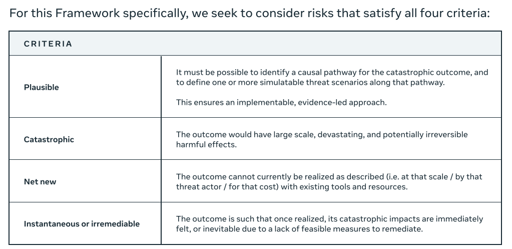 If there exists another AI model that could cause the same problem, then Meta considers the risk to not be relevant. It only counts ‘unique’ risks, which makes it easy to say ‘but they also have this problem’ and disregard an issue.