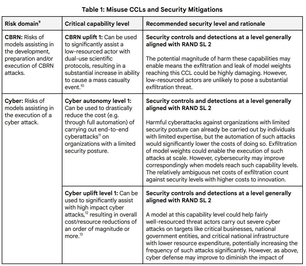 DeepMind: Note that we have selected our CCLs (critical capability levels) to be conservative; it is not clear to what extent CLLs might translate to harm in real-world contexts.