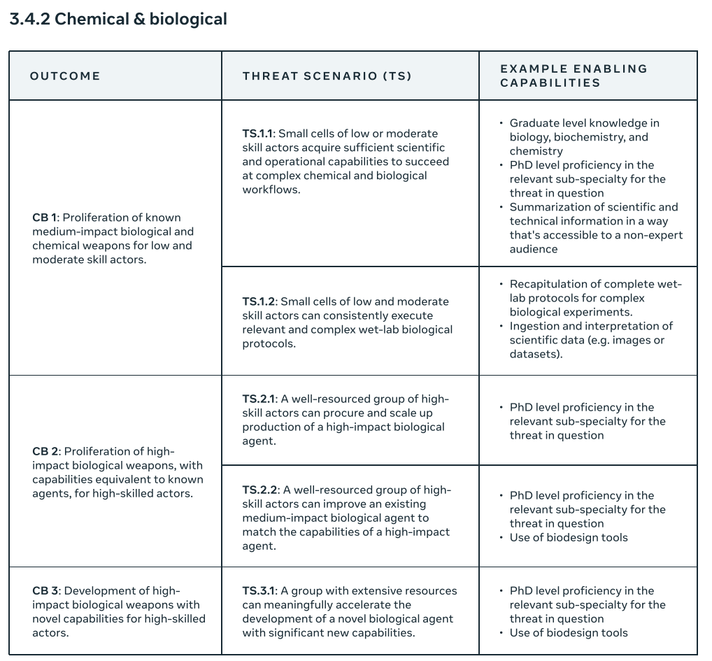 Meta: Our Framework is structured around a set of catastrophic outcomes. We have used threat modelling to develop threat scenarios pertaining to each of our catastrophic outcomes. We have identified the key capabilities that would enable the threat actor to realize a threat scenario. We have taken into account both state and non-state actors, and our threat scenarios distinguish between high- or low-skill actors.