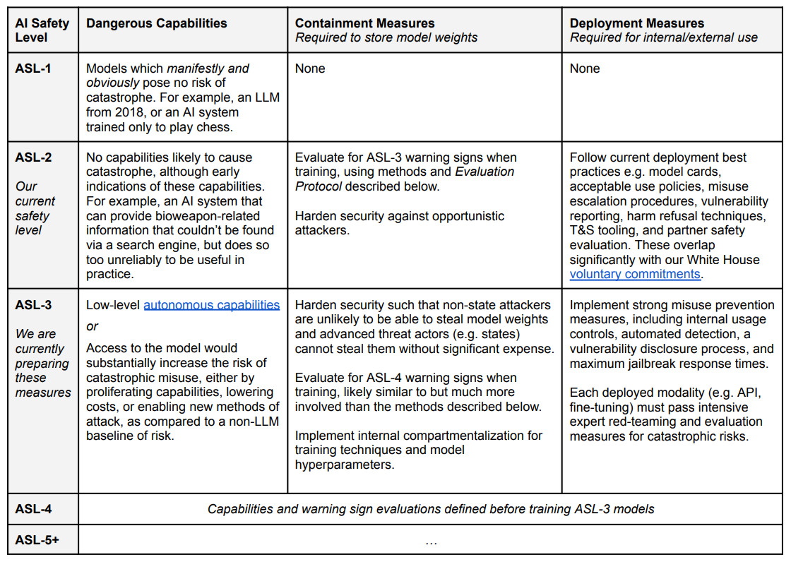 For those not familiar, the core idea is to classify models by AI Safety Level (ASL), similar to biosafety level (BSL) standards. If your model is potentially capable enough to trigger a higher safety level, you need to take appropriate precautions before you scale or release such a model.